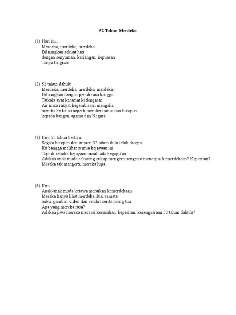 Kertas Kerja Sambutan Kemerdekaan 2020 Malaysia Prihatin Sumber Pendidikan from sumberpendidikan.com Dah tonton like &subscribe ye.sila hai teman teman yang ingin turut nyumbang puisi dalam channel video youtube kami yang baru launching dengan nama channel gubahan makna. Bahwa yang terjadi kemarin, telah menyalahi kuasanya. Budak yang merdeka karena kematian tuannya (mudabbar). Negaraku tetap merdeka kerana ada anak malaysia berbangga dengan negaranya berjuang hingga ke akhir nafasnya. Serupa gema di tengah malam merempuh. Seperti senyum gadis di pertemuan menerawang. Ia masih segar dan sesuai untuk dideklamasikan semoga sajak kemerdekaan yang pernah dihasilkan oleh tokoh sasterawan negara dan tokoh sastera kita ini dapat menjadi inspirasi buat kita. Budak yang merdeka karena berjanji membayarkan kompensasi tertentu pada majikannya (mukatab).