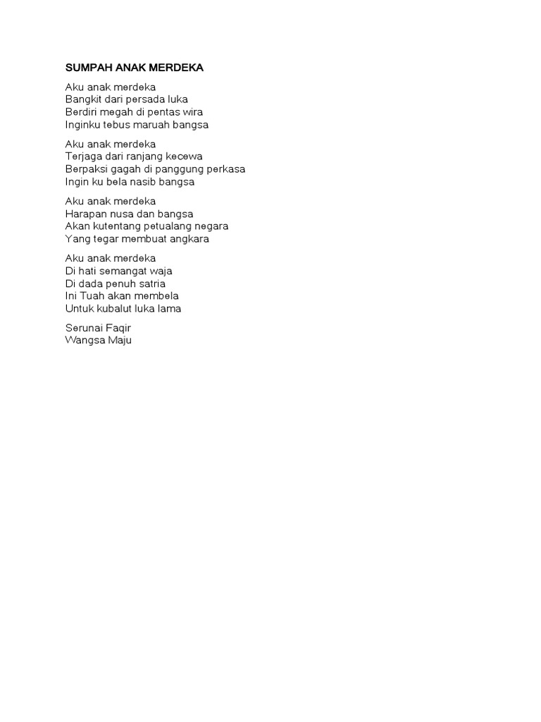 Doa majlis yang sangat mudah dan ringkas. Ia masih segar dan sesuai untuk dideklamasikan semoga sajak kemerdekaan yang pernah dihasilkan oleh tokoh sasterawan negara dan tokoh sastera kita ini dapat menjadi inspirasi buat kita. Kemerdekaan sajak merdeka yang ringkas. Sajak aku anak merdeka yang pendek. Menurut kbbi sajak adalah bentuk karya sastra yang.