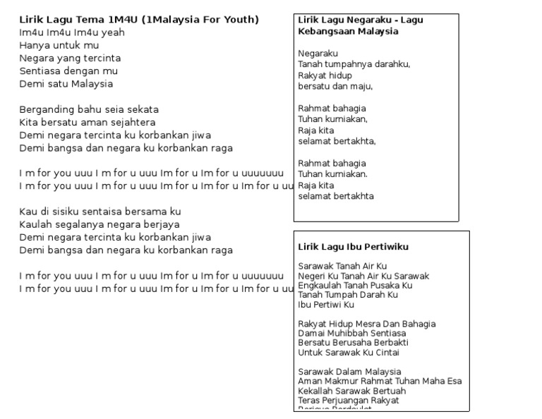 Berikut adalah lirik lagu aku negaraku, lagu patriotik terbaru yang kini diwajibkan dilagukan di perhimpuan mingguan semua sekolah di bawah kementerian pendidikan malaysia: Lagu aku negaraku adalah lagu berentak kontemporari, merupakan ciptaan audi mok chuang yew dan liriknya ditulis oleh. Lirik negaraku berentak baru masih sama. Semangat patriotik sangat penting untuk membentuk sebuah negara yang maju, aman dan makmur. Lagu negaraku negaraku tanah tumpahnya darahku, rakyat hidup bersatu dan maju, rahmat bahagia tuhan kurniakan, raja kita selamat bertakhta, rahmat bahagia tuhan kurniakan. Berikut dikongsikan lirik lagu aku negaraku sebuah lagu patriotik yang wajib dinyanyikan oleh pelajar dalam perhimpunan sekolah bermula dari tarikh 22 ku sedar tanah air aku bertuah di sini tempatku berjasa ku sedar sempurna hidupku di sini malaysia ku terhutang budi. Lirik lagu negaraku lagu kebangsaan malaysia. Lagu malaysia negaraku dengan lirik sports day activities malaysia animation art for more information and source, see on this link : For more information and source, see on this link : For more information and source, see on this link : Borang pengesahan pendapatan tidak bekerja; Terus berjaya dan subur bahagia malaysia negara ku yang kaya tetap terpuji serata dunia Bendera malaysia oh bendera ku.