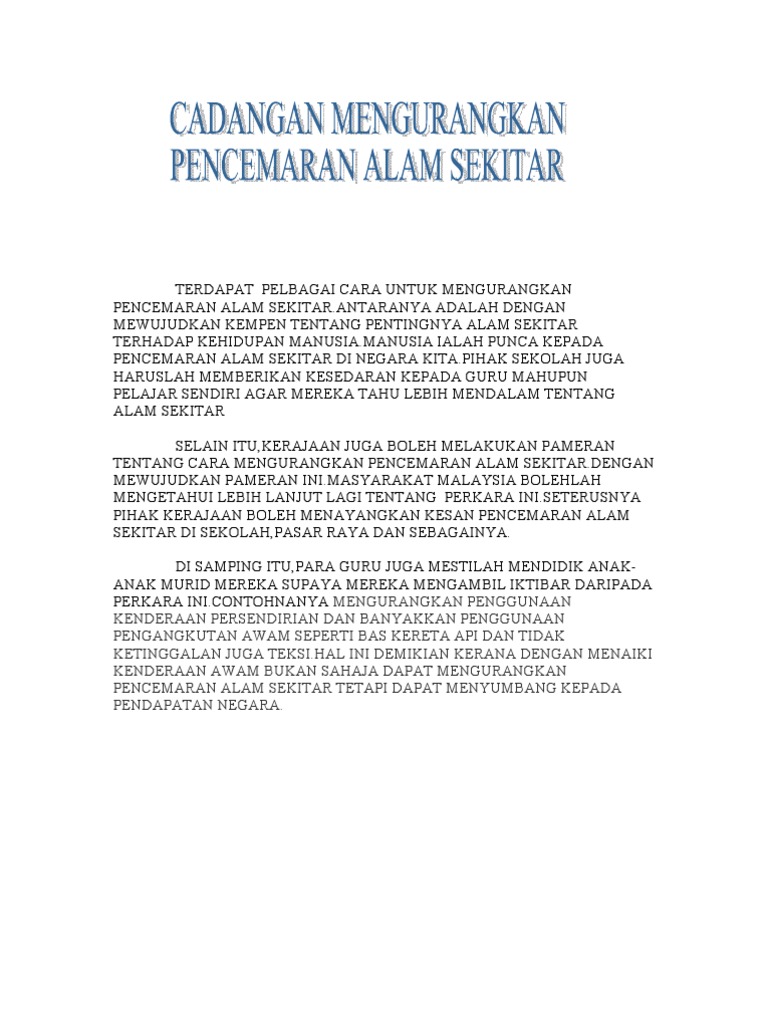 Kesan Positif Pelancongan Cameron Edit from demo.pdfslide.tips Pencemaran, air, udara dan bunyi, hakisan, tanah runtuh, dan gelongsoran tanah dan perubahan landskap. Kesan penggunaan pengangkutan awam terhadap alam sekitar seiring dengan dunia maju yang lain, negara malaysia juga sedang bergerak ke arah kemajuan. Ia telah banyak membawa perubahan dan kebaikan pada taraf hidup masyarakat malaysia. 3 (1) ^ rodrigue, dr. Sudah menjadi kebiasaan setiap hari penduduk bandar akan memandu ke tempat kerja. (2010) pendedahan kediaman terhadap pelepasan lalu lintas dan hasil kehamilan yang buruk. Tambahan lagi, kajang kini sudah berkembang pesat. Akibat meminum air yang tercemar, manusia akan dijangkiti penyakit menular, penyakit ginjal, artritis, sakit kepala,tekanan darah tinggi, penyakit kulit, kanser, gangguan sistem saraf, penyakit hati, jangkitan sistem penghadaman, penyakit batu karang, batu dalam hempedu dan sebagainya.